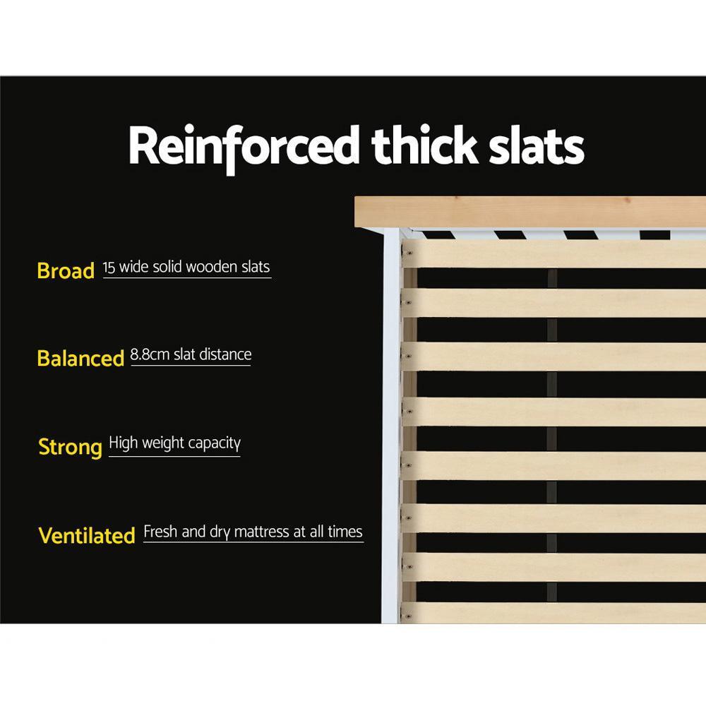 Constructed of solid pine wood, the bed frame features quality plywood slats smooth finished edges, heavy-duty steel fixings and reinforced bracket support across the frame that cheaper alternatives do not provide.