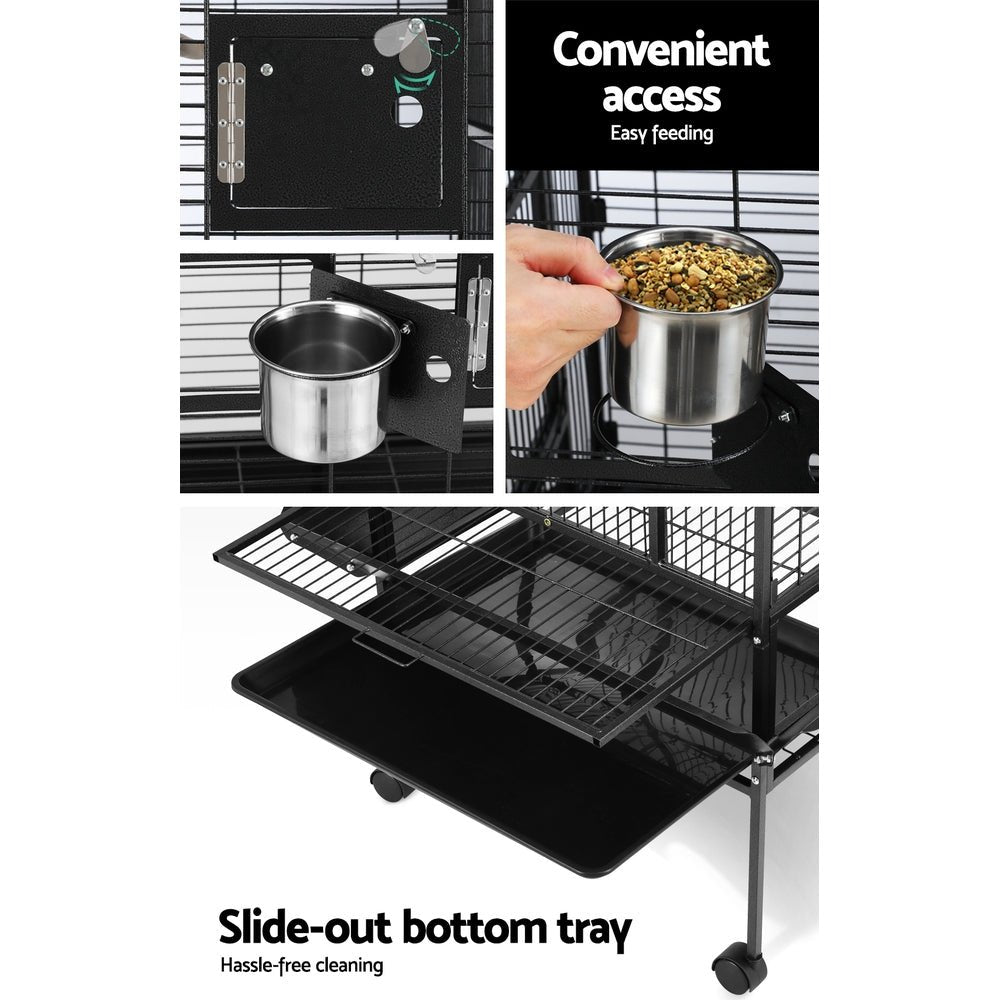 Taking care of them is made easy too with one large access door and two side doors to reach inside the five food and water bowls and take them out for refills or cleaning. Cleaning is hassle-free with the slide-out top and bottom tray that can also be removed. And your feather friends will feel extremely safe too with a set of secured locks to keep prying predators away. Including that nosey parker feline from next door.