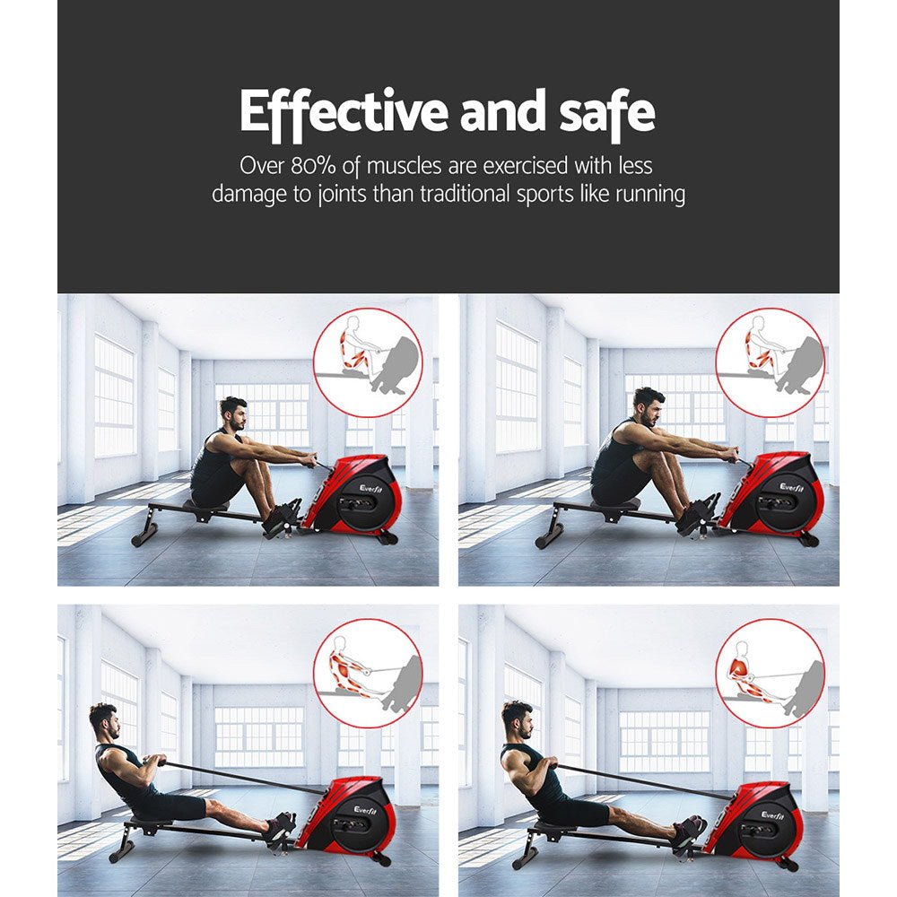 Simple but satisfying. Our Everfit Rowing Machine, utilizing an elastic-rope system, targets all the major muscle groups for well-toned abs, back and legs. Simply select the workouts you desire, with up to four levels of manual resistance, and monitor the progress on the large LCD display console. This fitness machine is just perfect for home fitness routines with its quiet operation and super sturdy frame. Featuring anti-slip footrests with adjustable foot straps to ensure secure smooth glides, the Rowing Machine also has a moulded seat for comfort while burning up the calories. With a weight capacity of up to 150kg, the Rowing Machine is no push over in terms of strength and durability. And when the huffing and puffing is done, simply fold it and store till the next session.