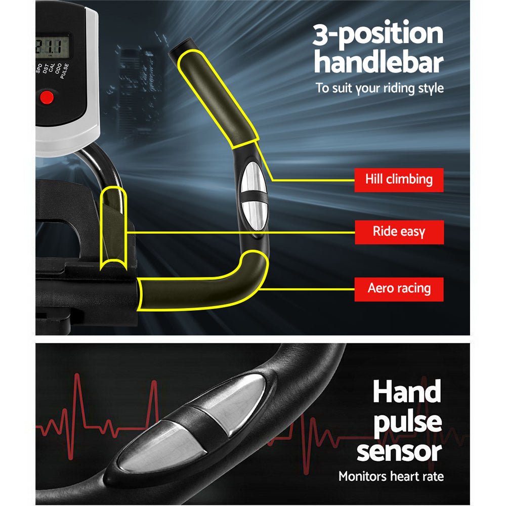 Now, nothing can stop your bike training regime. Not even bad weather. The Everfit Spin Bike helps to supplement your road biking sessions or lose some weight and get fit in the comfort of your home anytime. With a heavy-duty stainless steel 10kg flywheel and automotive-grade drive belt that delivers plenty of resistance via a control knob, the spin bike offers a smooth and noiseless workout. The frame itself is made of industrial-strength powder-coated steel for durable and robust use. Plus, an onboard computer with a LCD monitor assists in tracing six fitness parameters in one easy operation. The spin bike features an extra thick padded saddle seat that is fully adjustable in height and position. The handlebar is also adjustable to suit your handling comfort. Not least, the spin bike comes with non-slip feet pedals with straps and built-in transportation wheels for easy mobility.