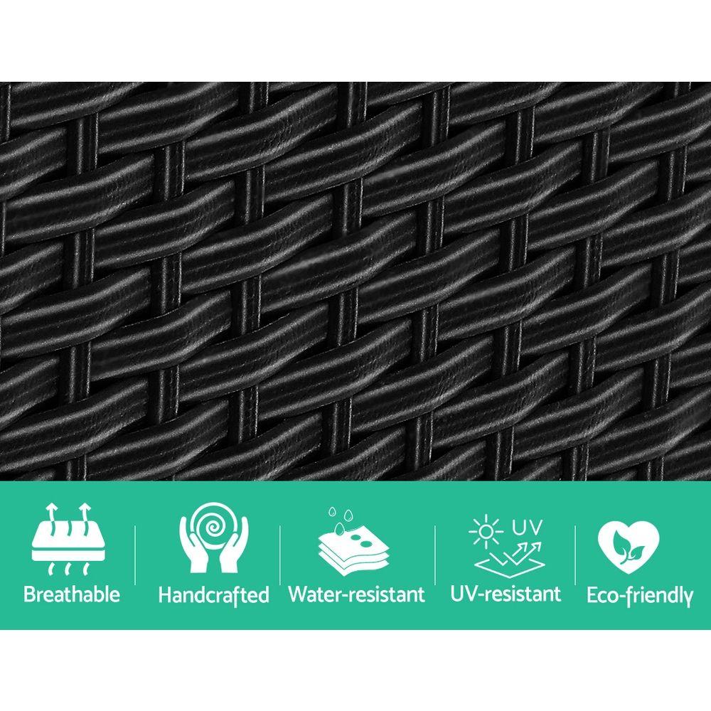 The UV-resistant and weatherproof PE wicker is meticulously weaved to bring out the exceptional workmanship and the chairs exude luxurious comfort with high-density foam cushions. Better still, the table features a double-deck design for extra storage space with a 5mm thick tempered glass tabletop for a sleek look and easy maintenance.