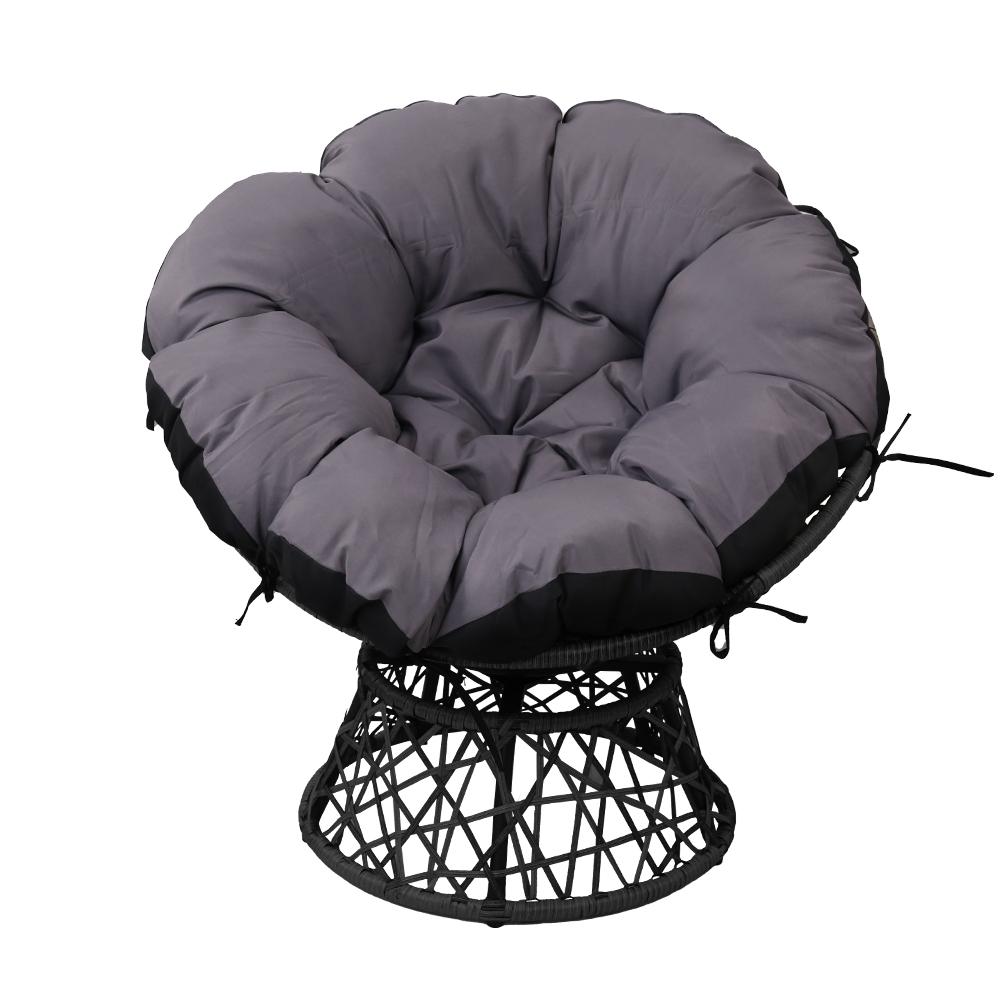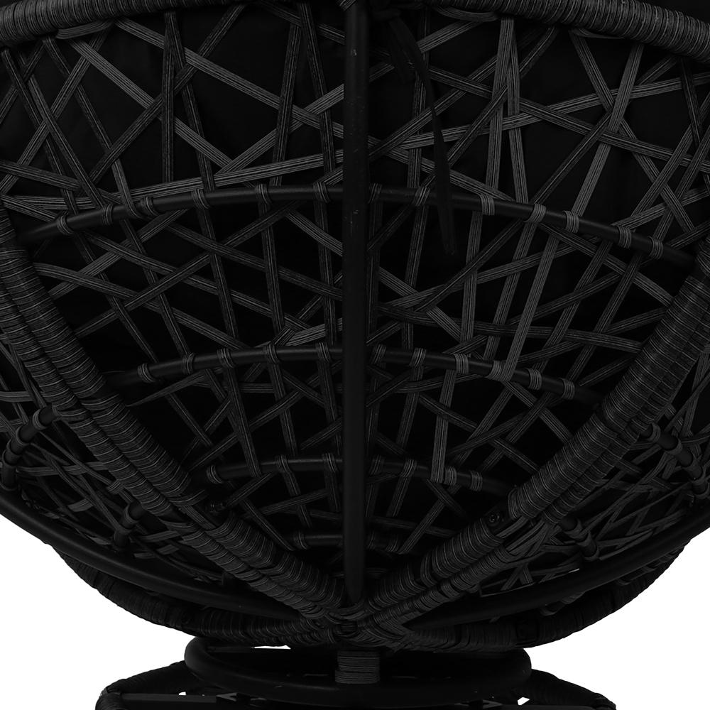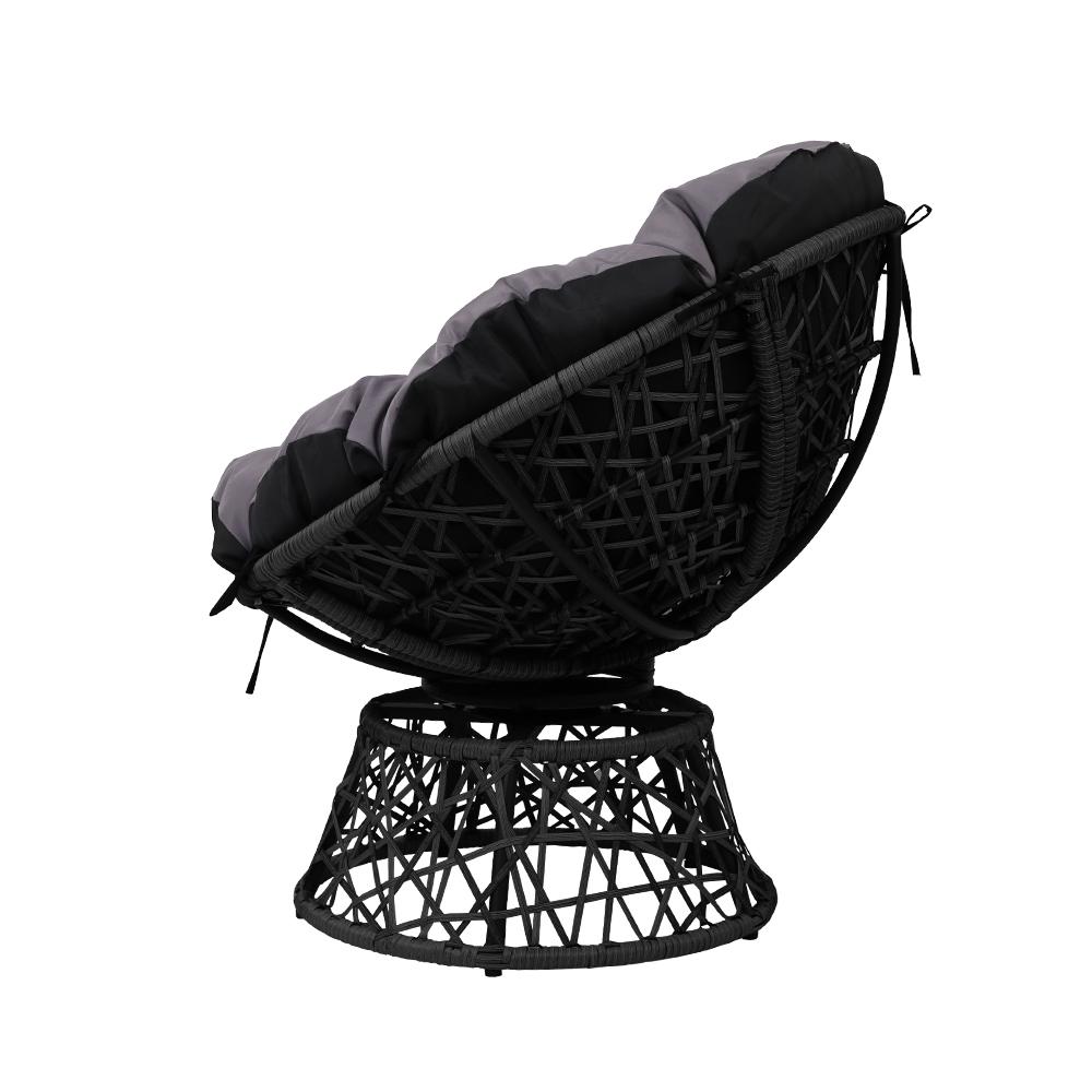 Our papasan chair is made of UV-resistant PE wicker and features wicker weaving around a durable steel frame. It is 360 ° rotatable and the cushion covers are also non-fading and removable for easy cleaning. It has a weight capacity of 150kg.