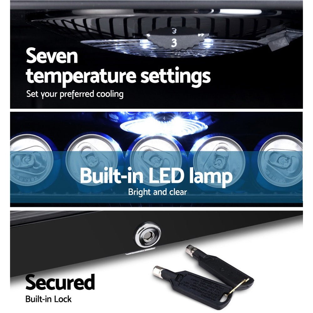 Our portable Devanti Bar Fridge is great for keeping a variety of food and beverages chilled and cooled without taking up too much space. Designed with seven temperature settings, the energy-efficient bar fridge lets you set your desired coolness and freshness. Other great features include adjustable shelves, double-glazed door, height-adjustable feet, built-in handle and consistent refrigeration to name a few. The compact bar fridge is also totally eco-friendly with its R600a freon-free refrigerant and well-made for robust use, such as the extra thick insulation and a built-in LED lamp to ensure operation is smooth, quiet and hassle-free. The fridge also comes with a built-in lock to keep the contents safe and secure, especially useful in a retail environment after you close for the night. Suitable for both domestic and commercial use, the Devanti bar fridge is a cool investment time and again.