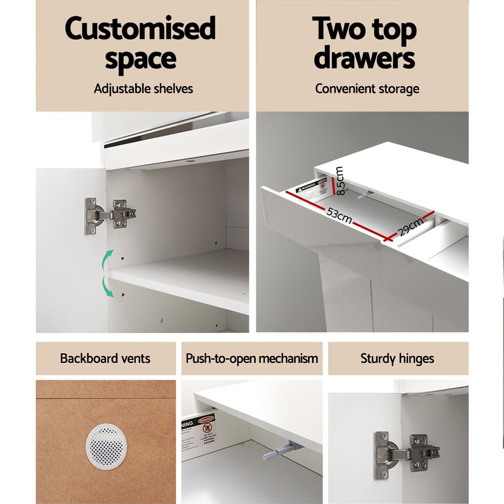 Better still, you also get two top drawers for storing any other home essentials. Plus, the cabinet also features thoughtful backboard vents, handy push-to-open mechanism and sturdy hinges to enable the unit to stand up to robust use. Not least, the durable 12mm particle board and MDF construction, with an UV high-gloss finish on the front, make this shoe cabinet an attractive welcome to any home entrance.