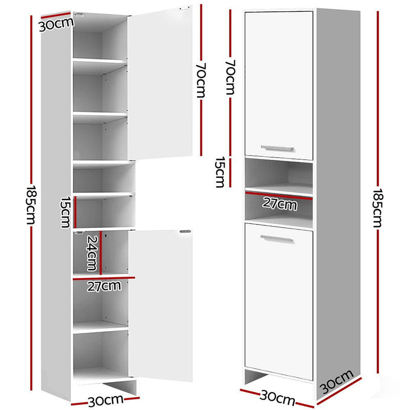 Our tall cabinet has a space-saving design, meaning it only uses up a tiny bit of floor space and can get into all the tricky nooks and crannies. Made of eco-friendly engineered wood with melamine finish, the cabinet features sturdy construction and eight tiers of storage. With two open shelves and two large closed cabinets with magnetic door catches, the cabinet provides more than ample space for all your bathroom or living room essentials despite its small footprint.