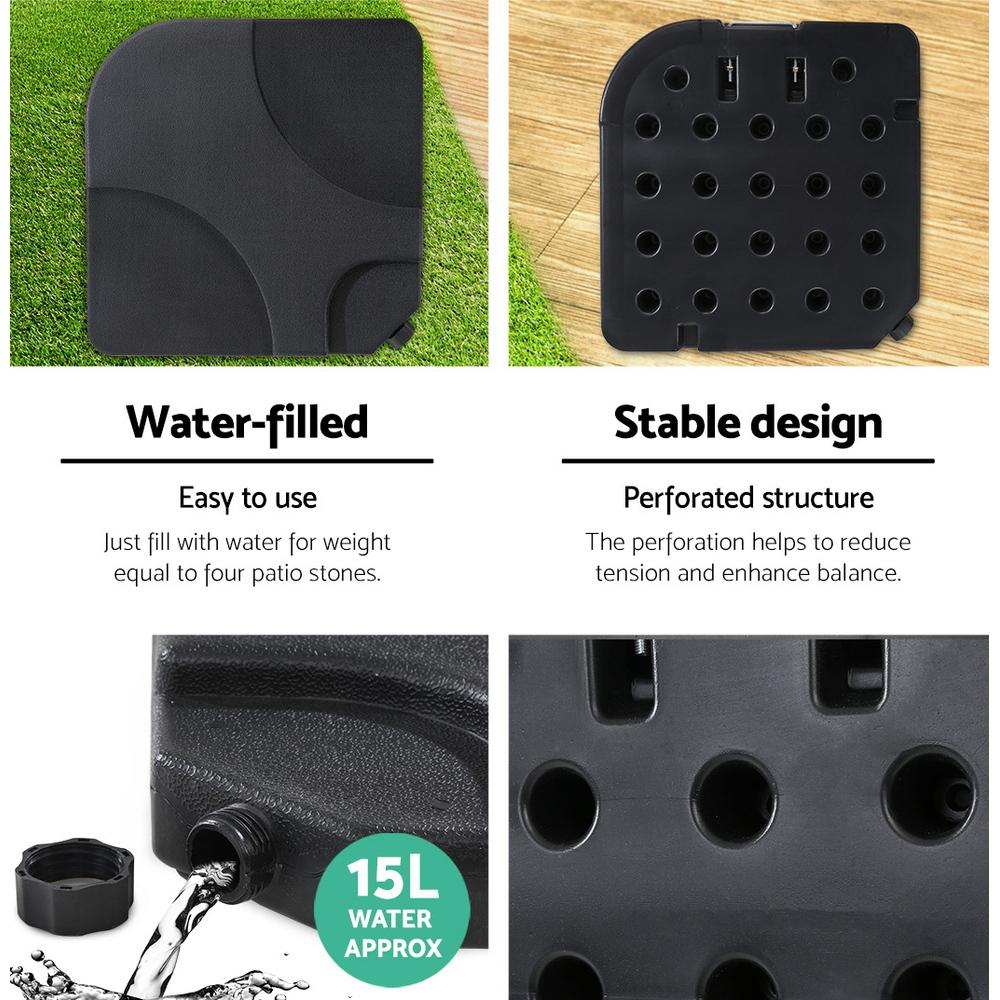 Better still, the umbrella top and base can be adjusted and pivoted towards the sun for the right amount and angle of shade. Opening and closing is also made easy with a user-friendly cranking system and the total assembly can be stored away with minimum fuss. Not least, the entire steel frame, such as the 8-rib top supports, and supporting pole are power-coated for toughness while the portable heavy-duty HDPE plastic base an be filled with sand or water of up to 60kg for a very firm support at all times.
