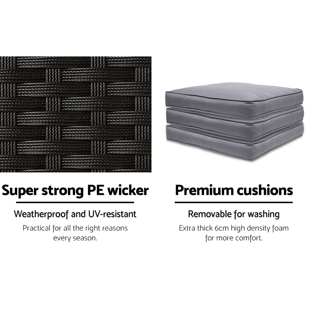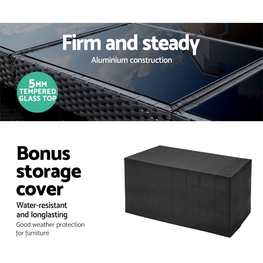If you spill your drink, the 5mm tempered glass tabletop and removable seat cushion covers make cleaning up hassle-free. With powder-coated steel construction and quality PE wicker finish, the bar set is designed to handle the rain and sun without any worries for years to come, and there is also a bonus waterproof storage cover included for added protection.