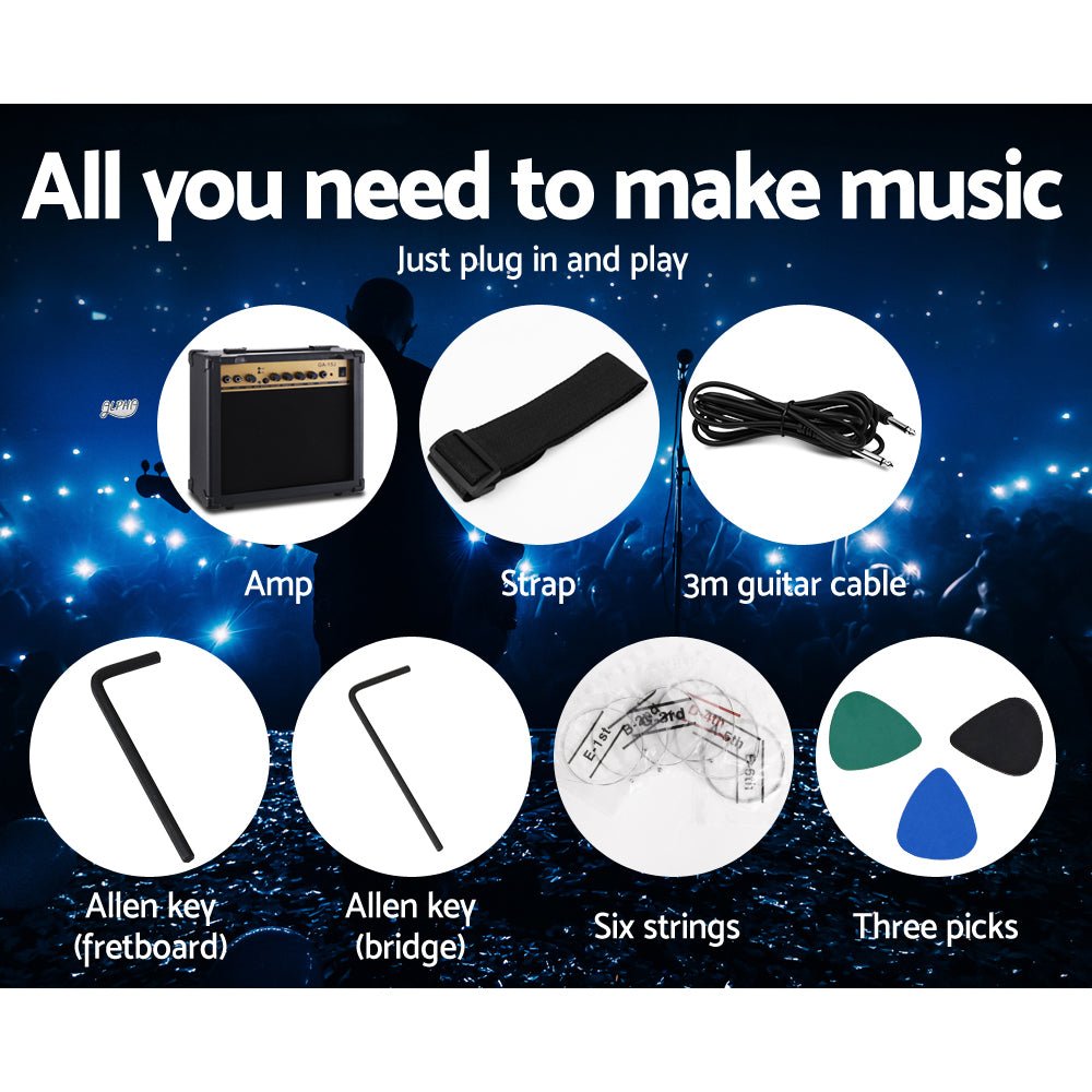And to make things even easier for you to get started on your music escapades, our combo set also includes a 20W guitar amplifier with dual inputs and controls for bass, middlle, treble, gain. There is also a headphone input to stop the neighbours from complaining night and day. So rock on with the Alpha Electric Guitar Combo Set for heaps of awesome coolness.