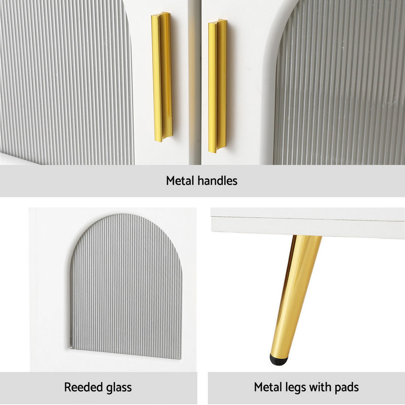 Introducing our contemporary coffee table with LED strip, USB connectivity, ample storage, sleek metal handles, melamine-coated particle board, reeded acrylic glass door, electroplated metal legs, smooth runners, easy maintenance, and assembly. Modern functionality meets stylish design.