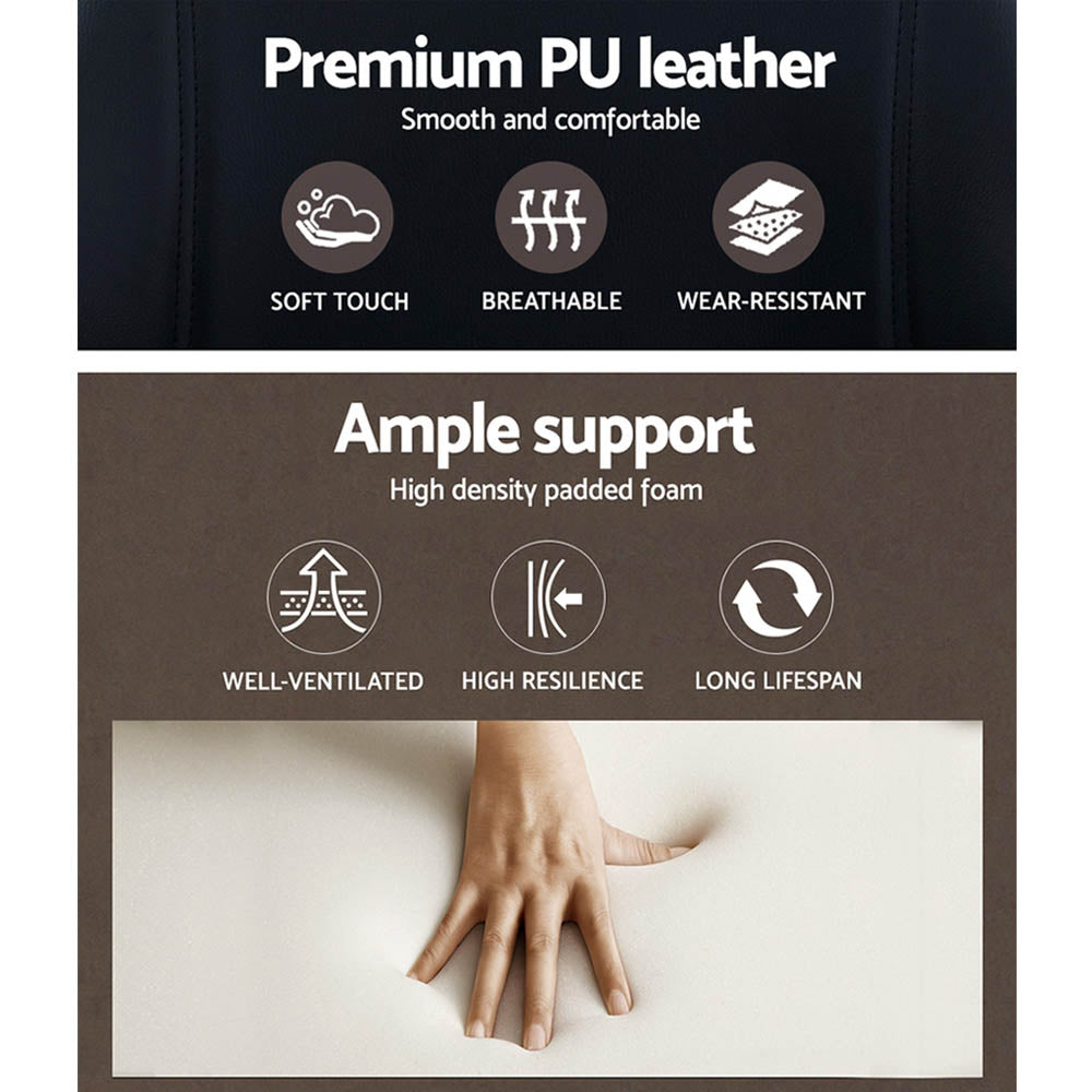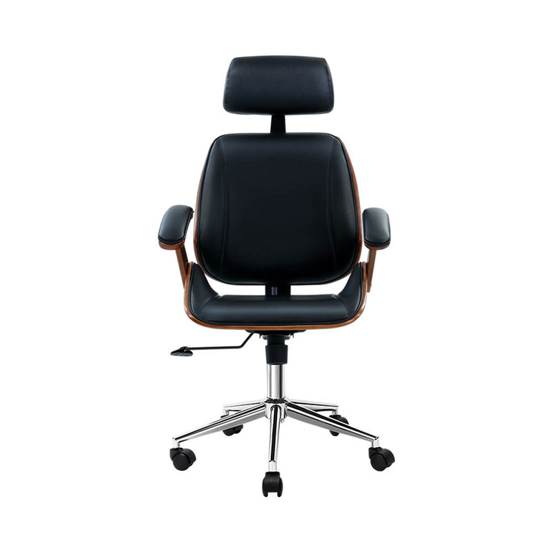 The seat is meticulously crafted with a contoured wooden frame, cushioned seat, back and arm support and premium PU leather upholstery. You have full mobility with this office chair as the seat rotates 360° to face any direction with ease and the corrosion-resistant chrome base has five smooth castor wheels attached.