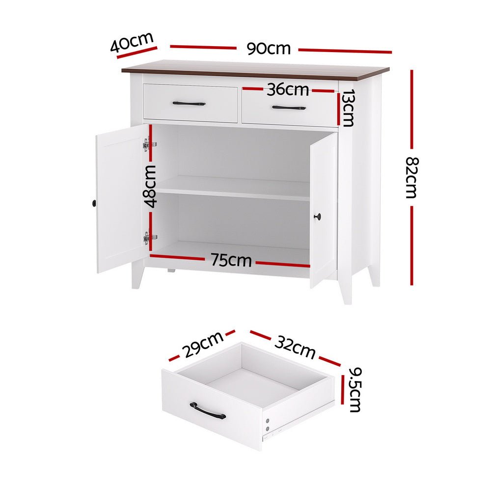 Upgrade your home with this storage cabinet, combining functionality and style. Designed with a premium walnut-look tabletop, it perfectly complements any modern or classic decor. The cabinet features 2 smooth drawers and inner shelves, offering ample storage for your essentials. Built with a robust MDF frame, it ensures durability and stability for everyday use. The sleek metal handles and knobs enhance its aesthetic, while the raised base allows effortless cleaning. An anti-tip kit is included for extra safety. Easy to maintain, clean, and assemble, this cabinet is an ideal addition to your living space. Order now and enhance your home organization today!