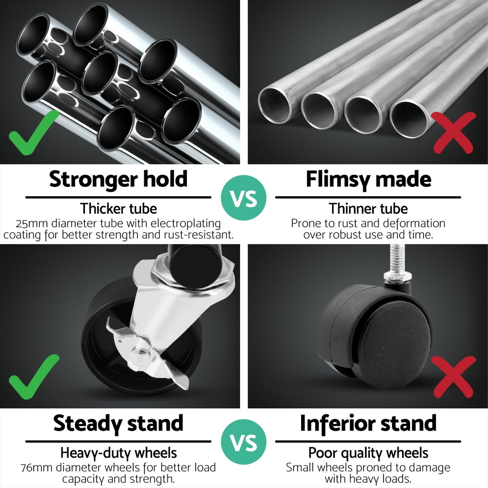 Organise outfits effortlessly with heavy-duty clothes rack, combining industrial strength with smart design. The corrosion-resistant metal frame ensures long-lasting support for coats, dresses, or other items. Glide smoothly across floors with 360° swivel casters – two lockable wheels keep the rack stationary when needed. Adjust the horizontal rod length to accommodate different clothing sizes, while protective plastic caps shield walls from scratches. Collapse the rack vertically for under-bed or cupboard storage. Perfect for rental spaces, retail displays, or daily home use!