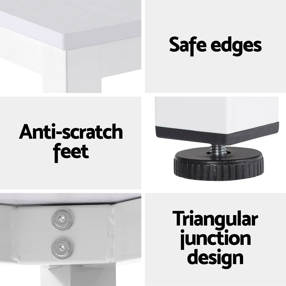 Conquer your workload in style and comfort with this versatile computer desk! The wide desktop provides ample space for your monitors, keyboards, and all your office essentials. While offering generous surface area, the 15mm thick particle board desktop maintains a sleek profile. The sturdy metal frame ensures stability, while anti-scratch feet protect your floor from damage. This modern and stylish desk has an easy assembly process and also prioritises your safety and comfort with smooth, rounded edges.