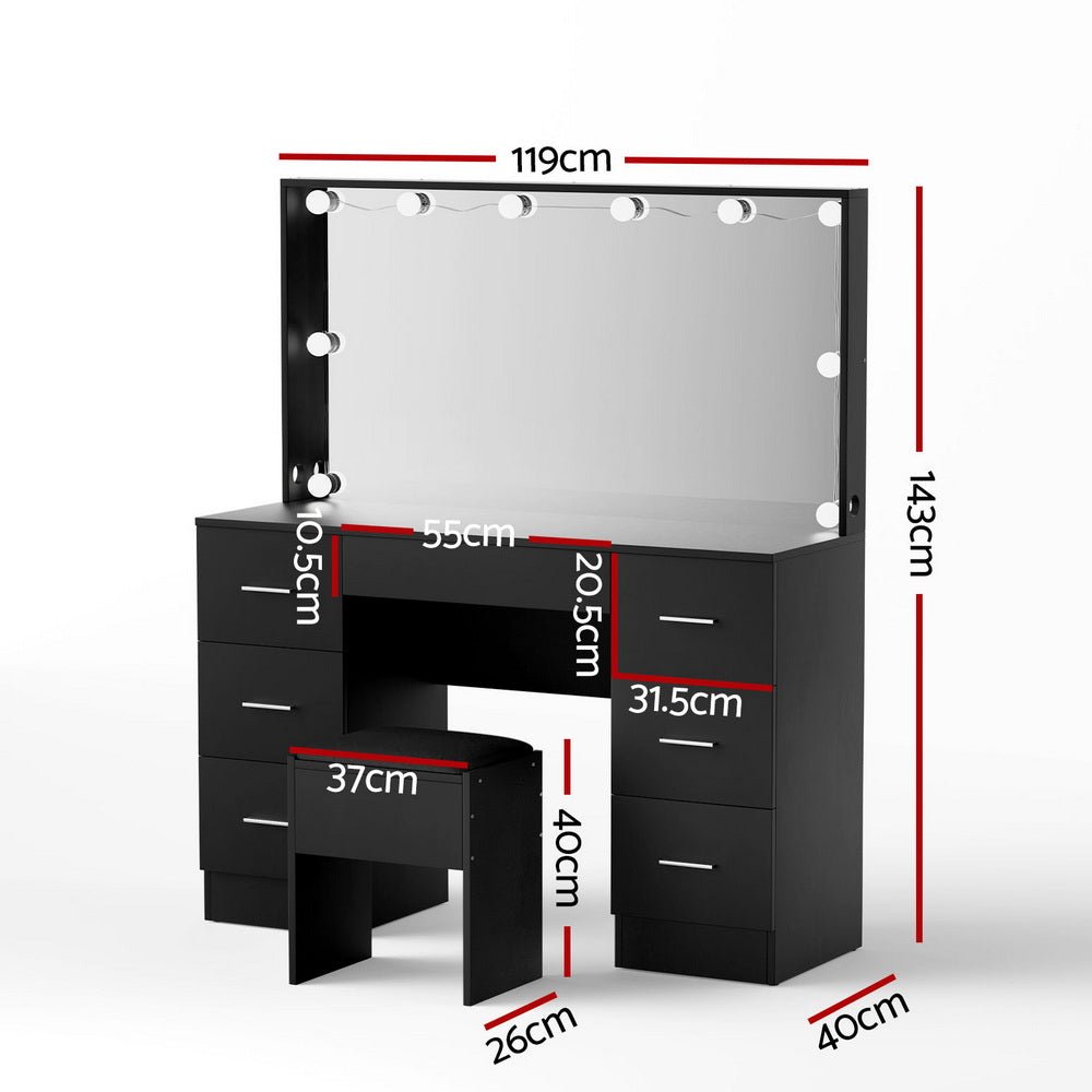 Elevate your beauty routine with the LED Vanity Desk. Featuring a Hollywood-style makeup mirror with 10 LED bulbs, this vanity offers adjustable 3 colour light modes and 10 brightness levels for precise application. The spacious tabletop accommodates all your essentials, while 7 smooth-runner drawers provide organised storage. Paired with a comfortable foam-padded stool, this durable and easy-to-maintain vanity is the perfect addition to your bedroom or dressing room. Stylish, functional, and thoughtfully designed, it's ideal for beauty enthusiasts seeking luxury and convenience.
