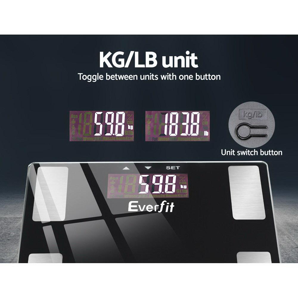 Measuring your weight and other health parameters has just become easier with Everfit Body Fat Scale. Equipped with a high-precision sensor system, the body fat scale measures up to seven parameters such as weight, water, body fat, bone, calories, BMI and muscle contents. The measurement range handles up to 180kg or 400lbs in accurate 0.1kg/0.2lbs scale division. The scale also has a durable 6mm tempered glass platform. To use the scale, just set up your personal data, select your profile and step onto the scale. The scale will display the results on the large LCD display after each weigh-in and you can store profiles of up to twelve users. With other great features such as low power/overload indication and auto on/off, the Everfit Body Fat Scale makes keeping track of your health fast and easy.