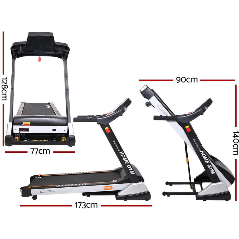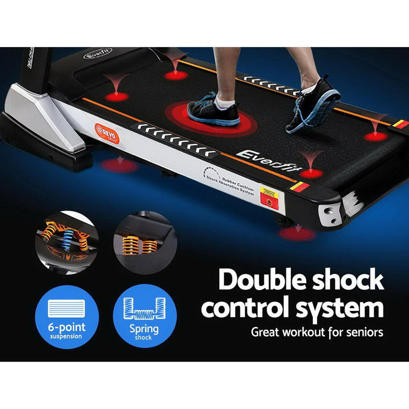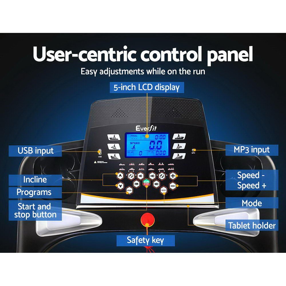 Compact and sturdy with its powder-coated steel frame, the Everfit Electric Treadmill allows you to perform essential cardio exercises within the comfort of your home. It features 12 pre-set training programs designed to simulate natural terrain. A user-centric control panel with a digital LCD display lets you set up to 18 speed levels and other monitoring parameters. Its linear power drive motor produces smooth and seamless operation and the anti-slip belt and soft-grip handle bar with pulse sensors make your session a comfortable and controlled experience. Other great features include a 15-level inclination adjustment, innovative double shock absorption system, automatic motor and belt lubrication, safety tether key and smooth wheels for easy mobility. Not least, the electric treadmill is also equipped with a USB and MP3 connection, dual speakers, dual drink holders and a tablet holder for those who like to work out in style.