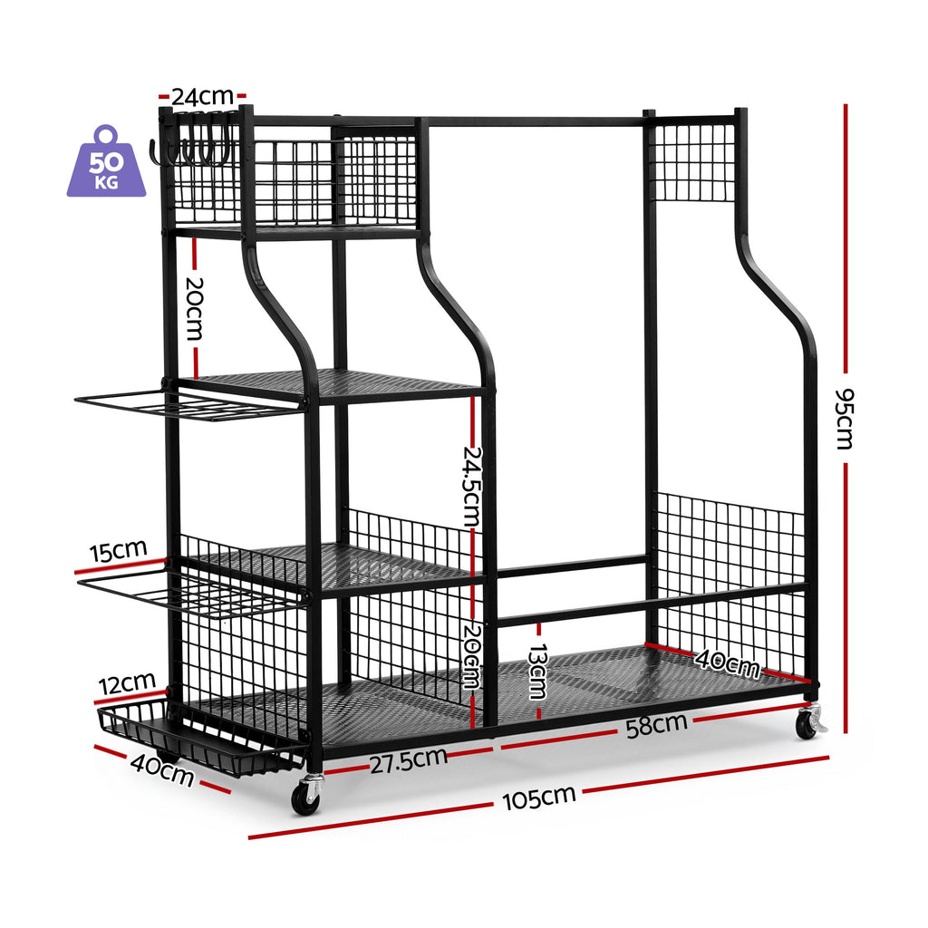 The Everfit Golf Storage Organizer provides ample space for 2 standard golf bags or 1 oversized bag, plus accessories. Features include a sturdy frame, 3 extra medium shelves, and a dedicated club display stand that holds 10 clubs. 2 lockable wheels allow easy mobility between garage, clubhouse or storage areas. The scratch-resistant black finish protects equipment while complementing modern decor.
