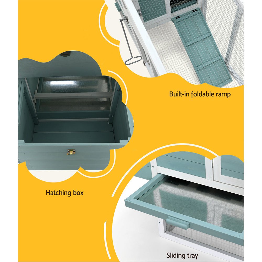 Give your beloved pets a safe and comfortable home to sleep, rest, play, and relax. The i.Pet's pet hutch makes a cosy home for your dear pets they will love and cherish forever. This pet hutch is suitable for smaller pets such as rabbits, chickens, hens, guinea pigs, hamsters, chinchillas and ferrets. Our pet hutch features a solid fir wood construction with galvanised mesh that ensures its sturdiness and durability for many years. It has a stable and firm base with strong metal support rod that's crucial for stability. Our pet hutch has green asphalt felt roof that provides good protection from sun and rain, keeping them cool in summer and warm in winter. It has a spacious integrated ground enclosed play area that allows your pets to have a great playtime outdoors. And the built-in foldable ramp that connects the ground area and hutch enables convenient entry and exit. Furthermore, the pet hutch also comes with a hatching box for egg collection and a slide-out tray for easy cleaning, and the entrance door with sturdy security locks makes it even more convenient and reliable. The enclosed play area has a mesh structure, which keeps your pets comfortable and well-ventilated. This pet hutch will give your beloved pets the utmost joy and pleasure. Gift this pet hutch to your pets today, and be sure to get much love in return.