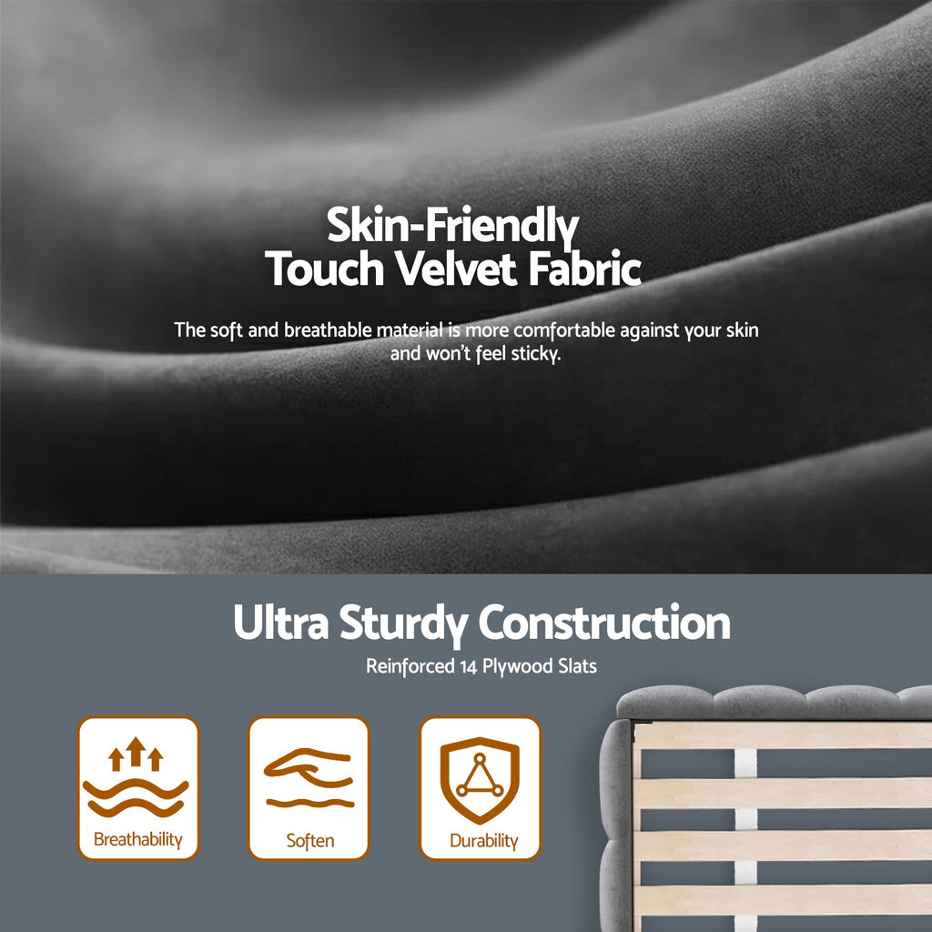 The Artiss King Bed Frame combines elegance and function with its cloud-inspired plush velvet headboard and modern platform base. Featuring a reinforced plywood-pine frame with 14 support slats and durable metal fixings, it holds 300kg and fits king mattresses (183x203cm). The smooth-edge velvet upholstery adds luxury while ensuring safety. Quick assembly completes this bedroom upgrade.