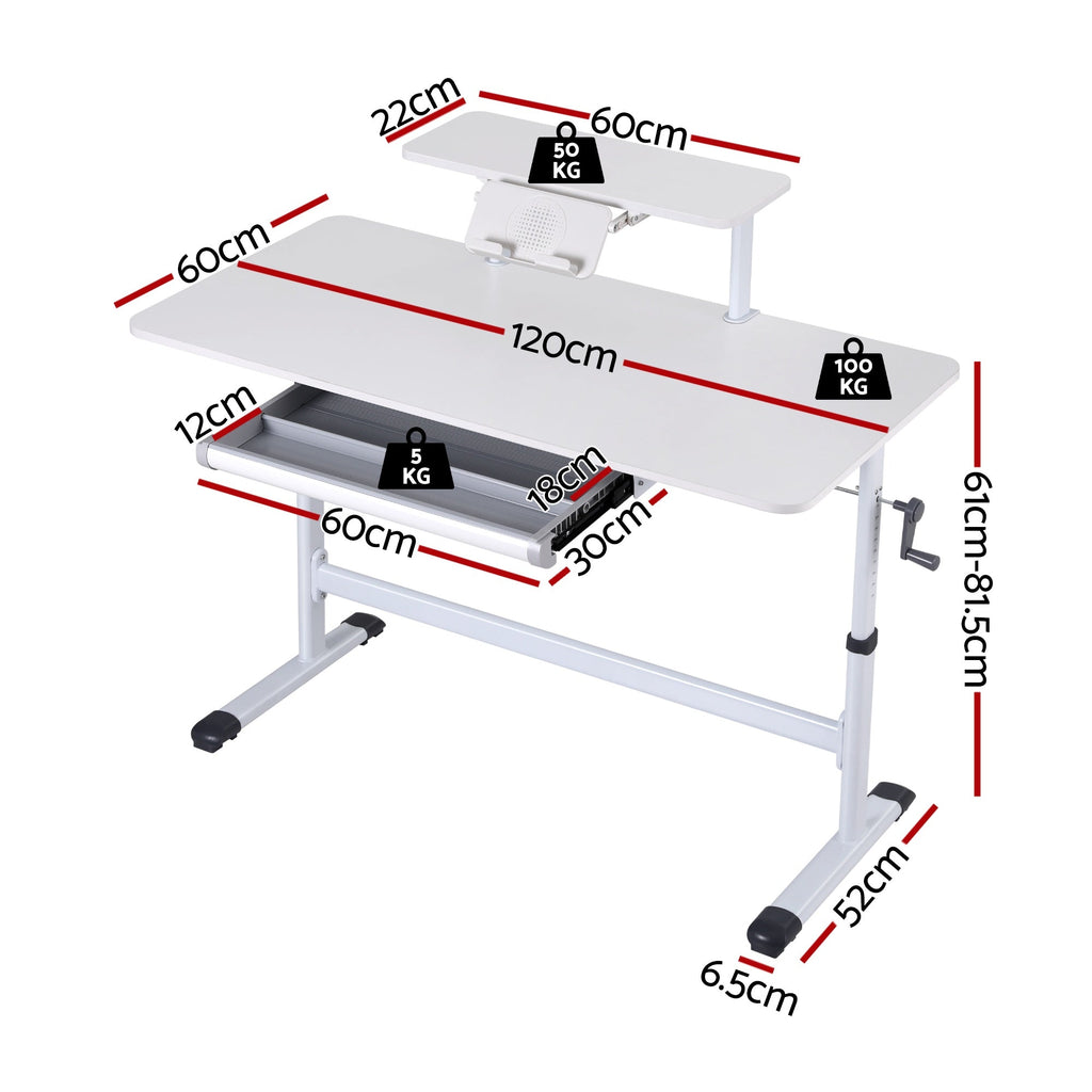 Create an organised and comfortabl study or workspace with this Artiss manual standing desk. Perfect as a study desk or home workstation, it features a smooth hand-crank mechanism for easy height adjustment. The built-in drawer helps keep supplies tidy, while the upper shelf offers extra space for books or decor. An integrated holder keeps your phone or iPad within reach. Supported by a sturdy brace, this adjustable desk provides reliable stability for your workday.