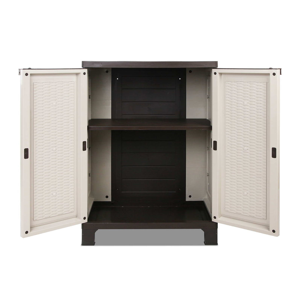 Outside, it shares similar attributes of the full-size cabinet with the same corrugated panel design for added support and style. The weather-resistant premium plastic construction ensures longlasting use while the stilted feet protects it against spills, floods or wet ground. No worries there of where you want to place it.