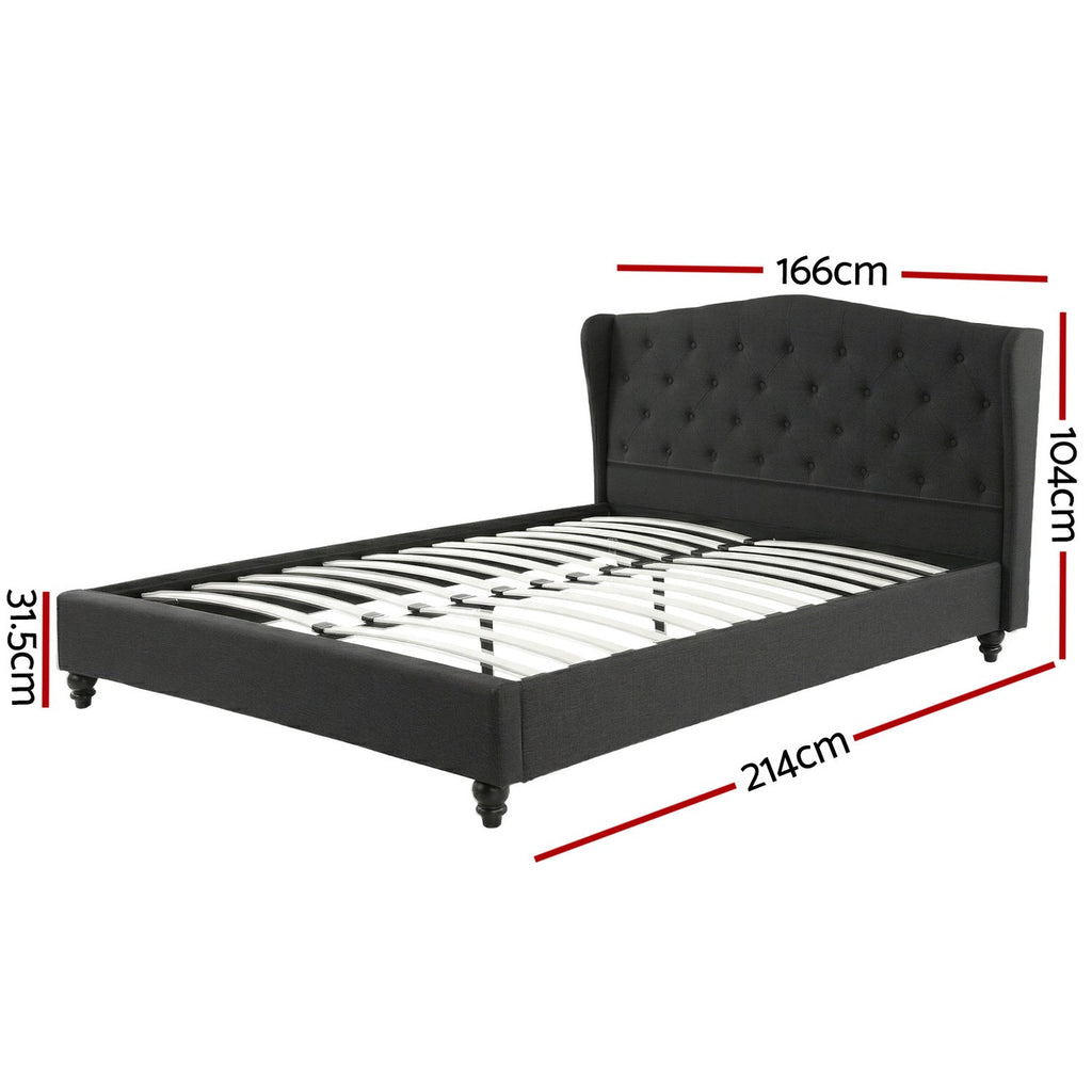 Elevate your bedroom with the Queen Bed Frame, featuring an elegant European-inspired wing headboard. Upholstered in premium woven linen fabric with tufted detailing and high-density foam padding for exceptional comfort. The robust steel frame construction features reinforced bars, heavy-duty connectors and wooden arched slats for lasting support. An adjustable centre strut enhances stability. Finished in versatile charcoal, this king size bed frame with headboard delivers timeless sophistication. Mattress sold separately