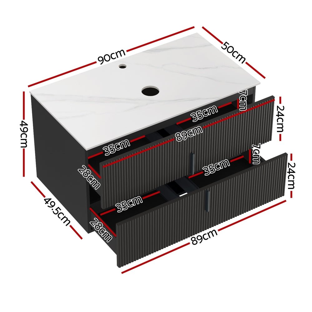 Transform your bathroom with the Cefito 900mm Black Vanity Unit, blending bold modern design and practical functionality. Perfectly sized for Australian homes, this wall-hung cabinet features a matte black soft-flute timber front, contrasted elegantly with a Carrara white engineered stone countertop for timeless appeal.
