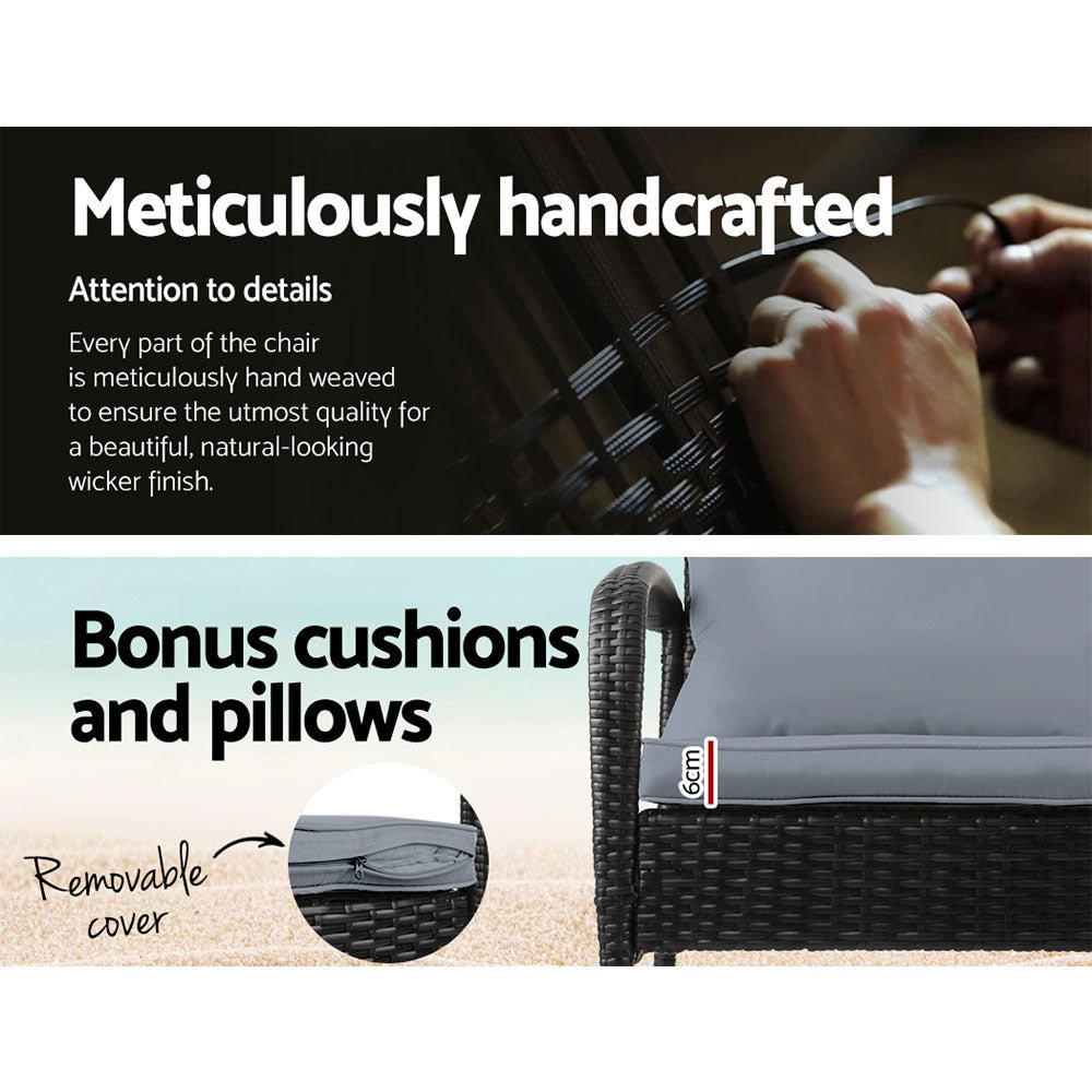 Gently sway to the better moments of life with the Outdoor Rocking Set. Our high-quality resin rattan chair and tempered glass wicker side table is made weatherproof and UV-resistant to stand up to the test of time and climate with their powder-coated steel frame and meticulous workmanship. Better still, the set comes with matching thick cushions and pillows with removable covers to let you rock your leisure time away with utmost comfort. Not least, the table also features a wicker border finish with a tempered glass top for safety and durability. So ease your mind, body and soul with the Outdoor Rocking Set. Perfect for both outdoors and indoors use.