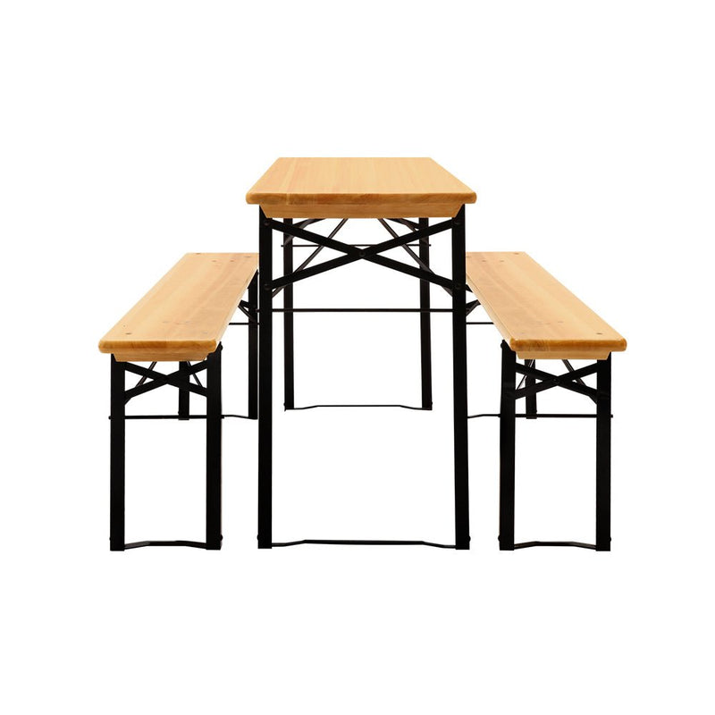 Comprising a 27mm thick Poplar wood table top and two matching benches, our outdoor ensemble is made for robust use in all weather conditions and treated for durability and reliability. The powder-coated metal legs are strong and rust-resistant and can be folded away to facilitate easy storage of the entire set if necessary. The natural wood grains are a beauty to behold too. And not just for the outdoors, the Set can also be used indoors for a unique take of a dining table or used separately for various décor ideas.